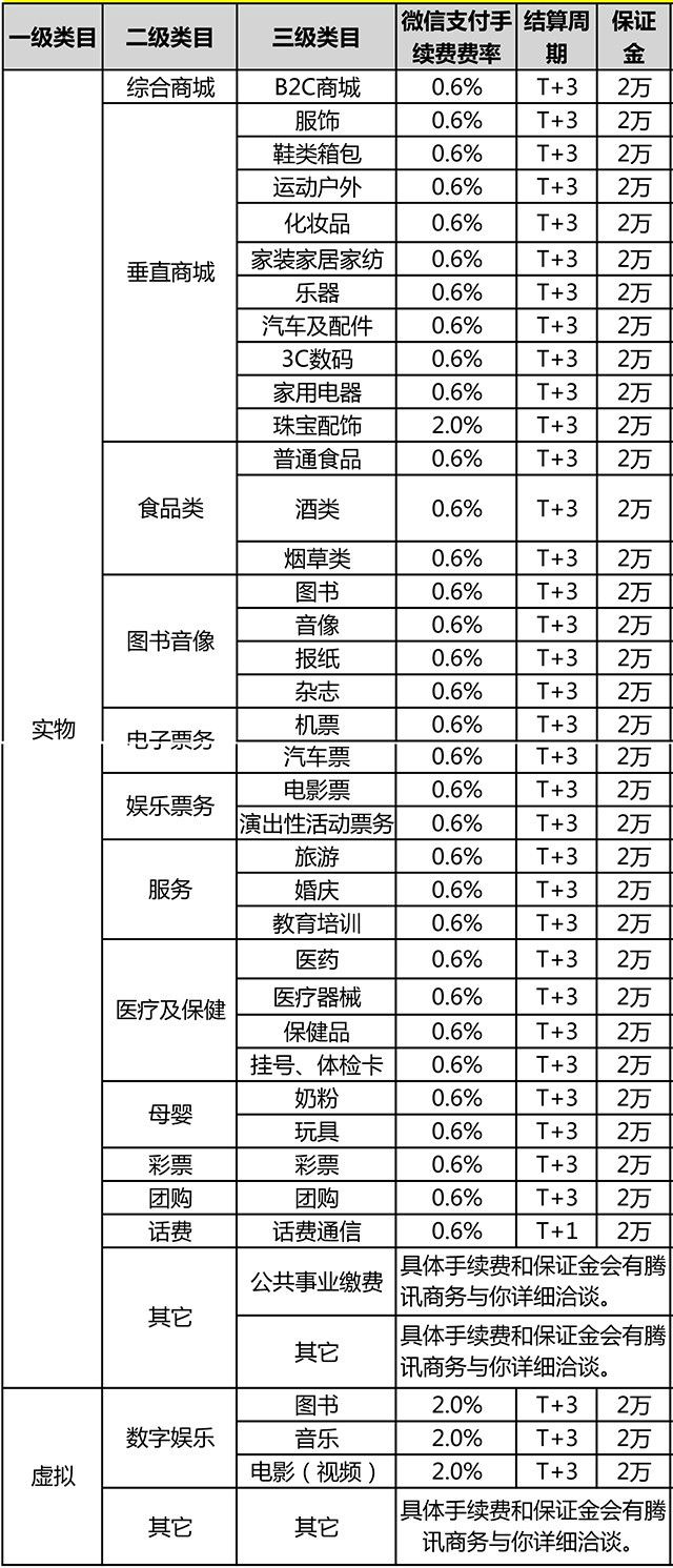 下图为“微信支付类目及费率对照表”,大家可点击放大查看: